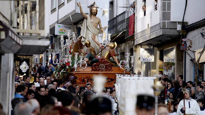 Tras la procesión del Encuentro de Resurrección, al mediodía, acaba de comenzar en Viveiro la procesión del Vía Lucis, con la que concluye la Semana Santa, una celebración que este año ha resultado especialmente exitosa, por la participación en las procesiones y por la afluencia de público. El buen tiempo -pese a la amenaza de lluvia al final lució el sol- animó también a sumarse a ver la última procesión del año. Desfilan los pasos de La Resurrección, de Leopoldo Rodríguez (2005/2008), y Nuestra Señora del Camino de la Luz, de Antonio Espadas (2013).